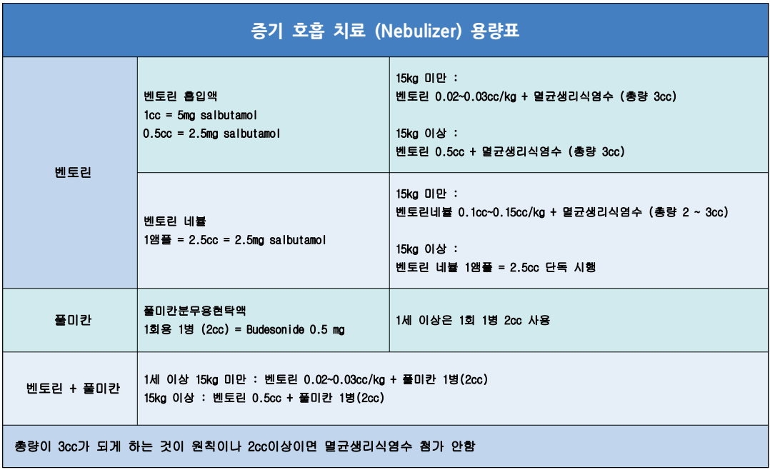 요약하면 풀미칸은 1세 이상에서 회당 한 앰플씩 사용하고, 벤토린 네뷸은 4세 이상에서 처방하되 15kg 이상은 한 앰플씩, 15kg 미만에서는 0.1-0.15㎖/kg (대략 반 앰플)씩 사용합니다. 벤토린 흡입액은 15kg 이상에서는 0.5㎖, 미만에서는 0.02-0.03㎖/kg 만큼 사용합니다.