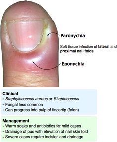 가장 초기 단계의 급성 손발톱주위염은 Dicloxacillin, Cefalexin, 또는 Clindamycin 등의 항생제를 경구 투여하고 혈류를 높이기 위해 자주 따뜻한 물에 적시는 방법을 사용하여 치료할 수 있다. 고름이 축적된 경우에는 빼내야 한다. 손가락이나 발가락을 리도카인 등의 국소 마취제로 마취한 후 기구를 사용하여 손발톱 주름을 들어 올린다. 피부 절제는 보통 불필요하지만 병변의 상태에 따라 절개 후 얇은 심지형 거즈를 삽입하고 24시간에서 48시간 동안 고름을 빼낸 후 봉합을 하기도 한다.