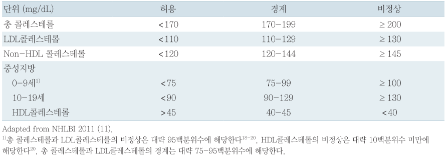 이상지질혈증의 청소년기 진단기준은 현재까지 전 세계적으로 정립되지 않았다. 현재는 2011년 National Heart, Lung and Blood Institute (NHLBI)에서 개정한 내용을 바탕으로 소아청소년에서 혈청 총 콜레스테롤 ≥ 200 mg/dl, LDL 콜레스테롤 ≥ 130 mg/dl, non-HDL 콜레스테롤 ≥ 145 mg/dl, 중성지방 ≥ 130 (10세 미만에서는 ≥ 100 mg/dl), HDL 콜레스테롤 < 40 mg/dl를 이상지질혈증으로 정의하고 있다.
