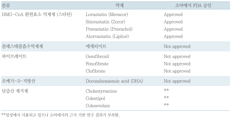 최근 소아청소년에서 LDL 콜레스테롤을 낮추는 일차 선택제로서 HMG CoA reductase inhibitor (Statin, 스타틴)를 사용한다. 스타틴은 콜레스테롤 전구체인 3-hydroxy-3-methylglutaryl coenzyme A (HMG-CoA)의 환원효소를 경쟁적으로 억제하여 간의 콜레스테롤 합성을 줄인다. HMG-CoA 환원효소를 억제하면 mevalonate 형성이 억제되는데, 이것은 스테롤 합성의 속도조절단계 (rate-limiting step)이고, 세포의 콜레스테롤 항상성이 유지되기 위해 LDL 수용체가 늘어나고 콜레스테롤 에스테르 형성은 감소한다. 그 결과 혈중 LDL 콜레스테롤이 더 제거되고 간에서 VLDL 생산이 줄며 이에 따라 LDL도 줄어든다.