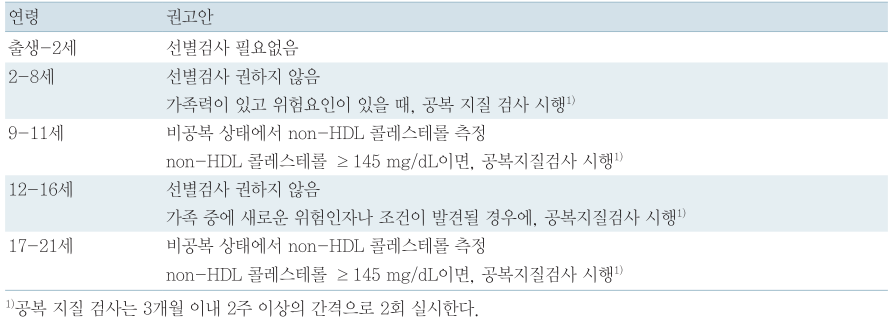 선별검사는 9~11세, 17~21세에 non-HDL 콜레스테롤을 이용한 집단검진을 권고하고 있으며, 가족력이 있고 위험요인이 있으면 만 2세가 된 후에 공복 지질검사를 시행하도록 권고하고 있다.