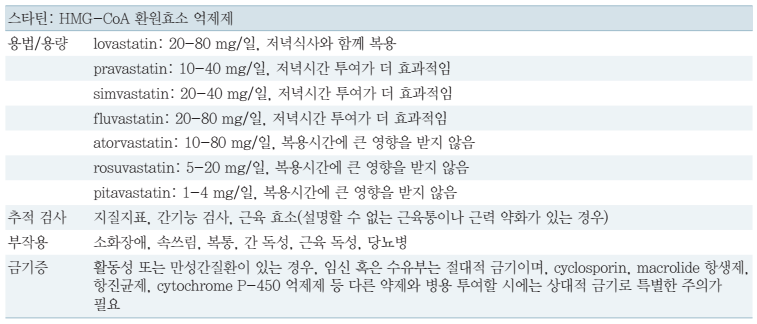 약물치료 4-12주 후에 콜레스테롤, 중성지방, HDL 조절 효과를 평가한다. 2회 연속 측정한 LDL 콜레스테롤 수치가 40mg/dl 이하라면 스타틴 감량을 고려한다. 투약 후 4~12주에 간기능 검사를 시행하고 그 이후에는 3~12개월 간격으로 반복하여 지질검사 및 AST/ALT, 필요시 CK를 검사하여 스타틴 효과와 독성 여부를 확인한다. 간수치 3배 이상, CK 10배 이상 상승 시 약을 변경하며, 지질농도 목표 달성 후 첫 1년은 2~3개월 간격으로, 다음 해에는 4~6개월 간격으로 검사한다.