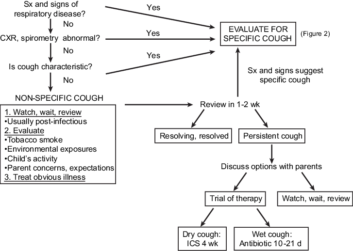 치료를 통한 진단을 시도할 수 있다. 천식이 의심되는 경우 폐기능검사와 기도과민성 검사를 실시하고 진단적 치료를 시도할 수 있다. 다른 원인을 찾을 수 없는 습식 기침의 경우는 항생제를 사용해 볼 수 있다. 하지만 특정 질환이 의심되지 않는 비특이적 기침이라면 환아의 전반적인 건강 상태가 좋다면 1주 간격으로 진찰, 검사를 하고 경과 중에 특정 질환이 의심되는 소견이 보이면 이에 대한 검사와 치료를 한다.