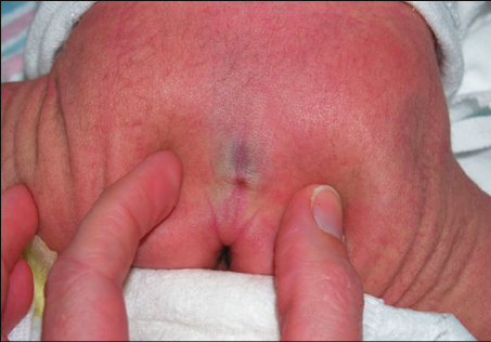 상기 소견이 없더라도 다수의 함몰, 지름 > 5mm, 항문에서 2.5cm 넘게 떨어진 함몰, 천미골 부위 이외의 함몰에 대해서는 USG 또는 MRI 검사를 시행하고, 이상 소견이 보이면 신경외과에 의뢰한다.