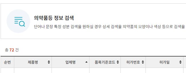 검색 완료 후 리스트가 나열된 조회 화면 상단의 각 항목을 클릭하면 오름차순 혹은 내림차순으로 정렬이 가능합니다. 제품명이나 업체명으로 정렬을 하여 내가 사려는 제품이 의약외품이 맞는지 찾으셔도 되고, 혹시 광고에서 특정 날짜에 허가를 받았다고 표시했다면 허가일 순으로 정렬해서 찾으시면 되겠습니다.