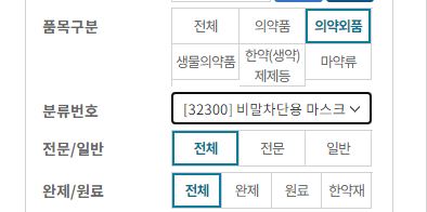 검색 상세정보란에서 수술용 / 보건용 / 비말차단용 탭을 선택하여 품목을 정할 수 있습니다.
