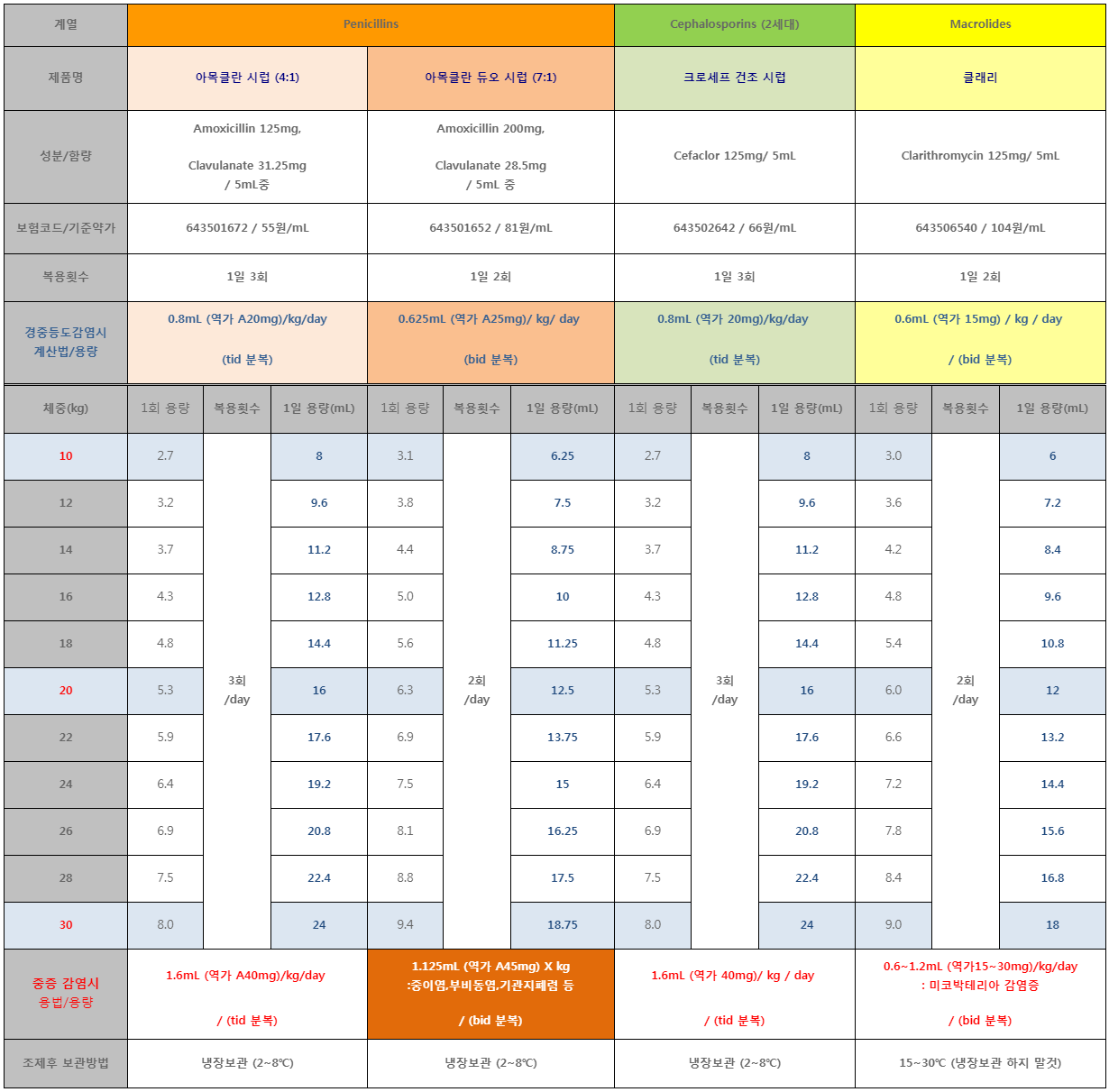 소아에서 경구 항생제 용량은 대부분 OOmL/Kg 으로 정량해서 투여하게 된다. 머리와 손이 기억하고 있어서 계산기를 두드리지 않아도 반사적으로 용량에 맞게 처방하게 되는데 혹시 참고할 경우가 생길 것을 대비해 표로 정리한 것을 첨부한다.